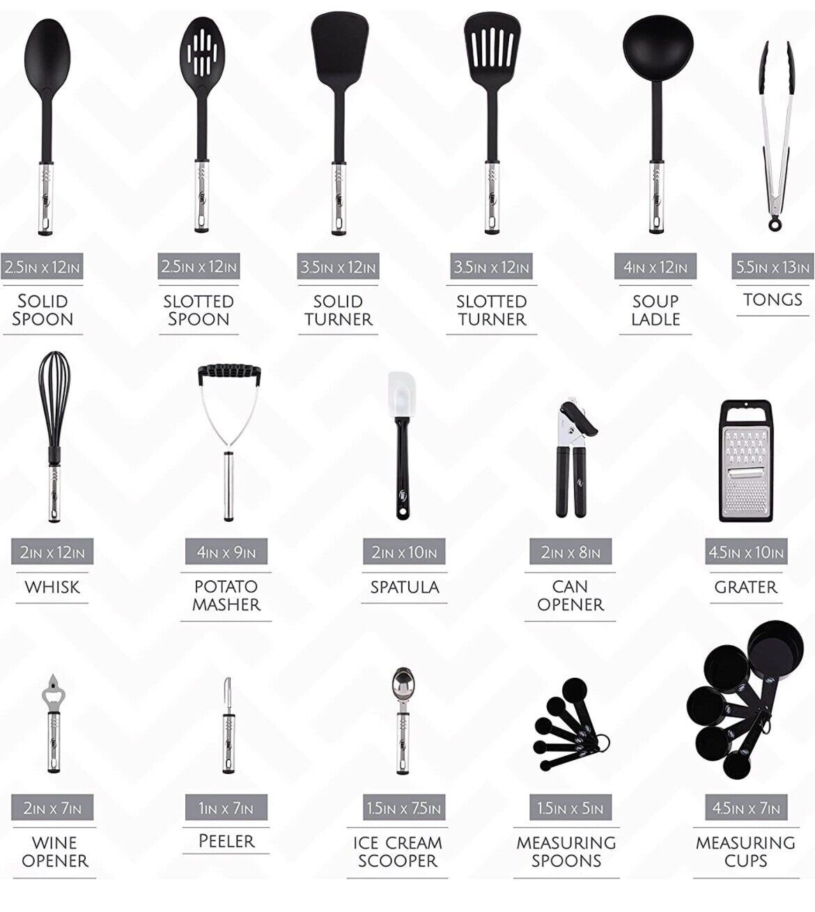 • Cooking Utensils Set Includes: Soup Ladle, Solid Spoon, Slotted Spoon, Solid Turner, Slotted Turner, Potato Pusher, Whisk, Grater, Spatula, Tongs, Can opener, Ice Scream Scooper, Wine Opener, Peeler, Measuring Cups, Measuring spoons.