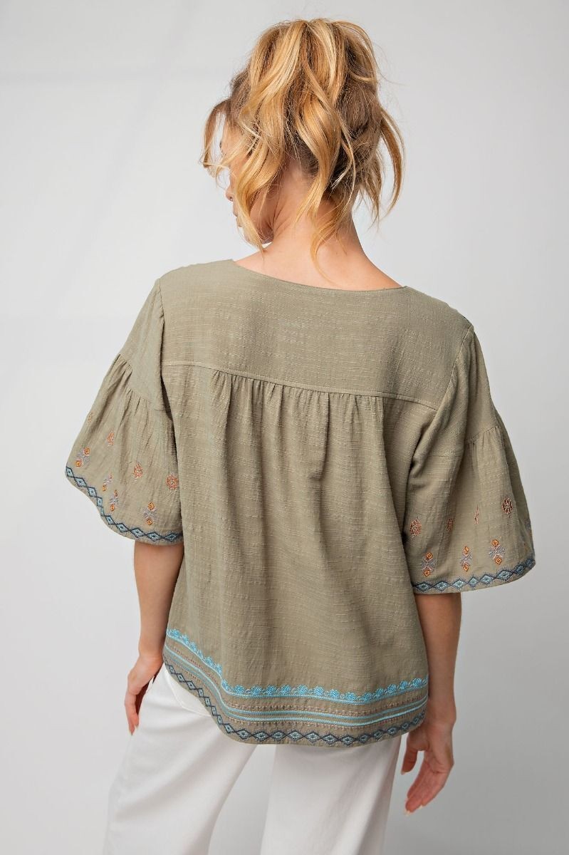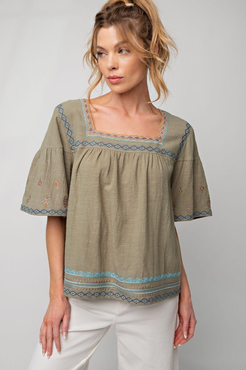Easel Clothing Embroidered Square Neckline Sage Top Women's