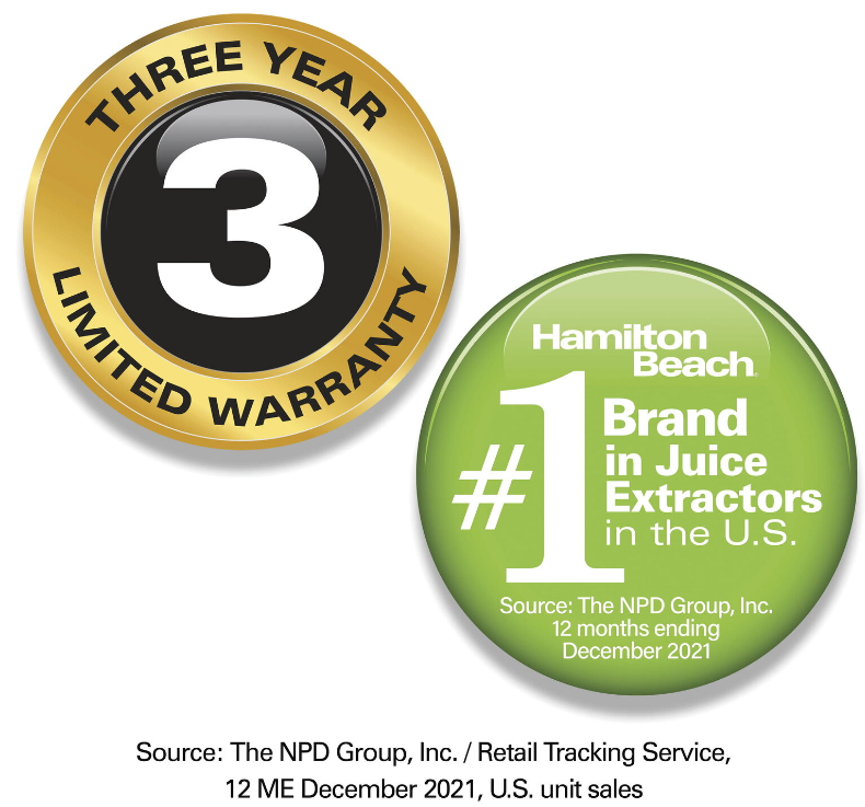 Juicing and blending go hand-in-hand as part of a healthy lifestyle, and now you can juice and blend with one space-saving appliance. Thanks to its versatile 2-in-1 design, the Hamilton Beach Big Mouth® Juice & Blend 2-in-1 Juicer and Blender makes fresh juice from whole fruits and vegetables, which you can add to all your favorite blended recipes. You’ll save time as you juice because the 3" Big Mouth® chute fits whole produce, and by replacing the juice extractor attachment with the 20 oz. blender jar, you can juice directly into it — no need to transfer juice from one container to another. With this versatile 2-in-1 appliance, you can go from making simple juice to creating a wide variety of flavorful smoothies, shakes, cocktails or slushies. You'll easily power through tough ingredients like hard produce and ice with its 800 watt, 2 speed motor and pulse. Amp up your nutrition and add more flavor to your life today — recipes are included to get you started. Includes patented Easy Sweep™ cleaning tool and removable, dishwasher safe parts for easy cleanup. Backed by Hamilton Beach, the #1 brand in juice extractors