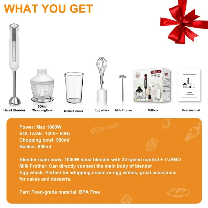 Upgraded 5-In-1 New hand blender customization and ergonomic handle including immersion blender, 500 ml chopper, 600 ml beaker, milk frother, blade shape chopper blade, and egg whisk. A variety of attachments can not only meet your needs for the variety of foods you make but also improve your cooking skills.