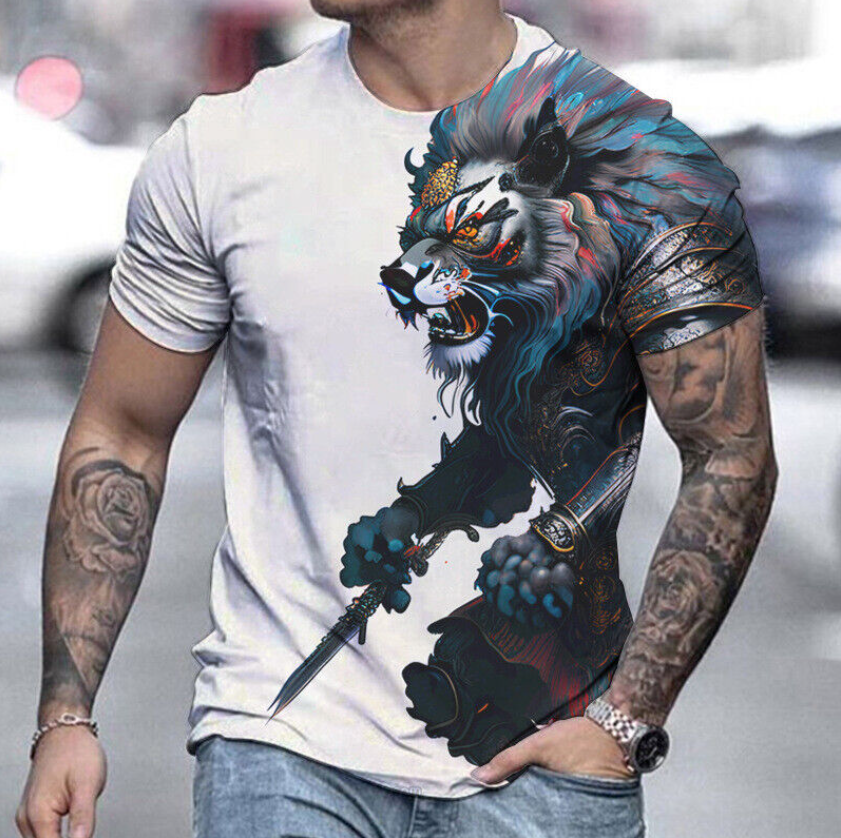 Men's Lion Print Short Sleeve T-shirt Street Trend Casual Tops Basic Tee Summer