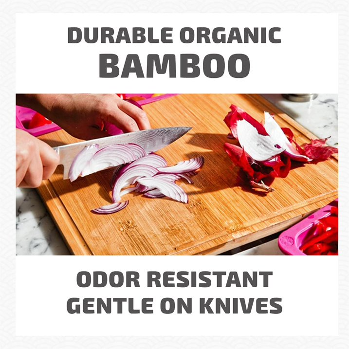 Tired of messy meal prep, food spilling on the floor, and fruit juice everywhere? Wash, cut, clean, strain, and store all-in-one with the ZenPrep Bamboo Cutting Board. 9 piece set. CHOP: 100% Pure Bamboo Cutting and Serving Board (20" x 15" size) RINSE AND STRAIN: 1 Large Silicone Strainer, 2 Small Silicone Strainers CATCH AND STORE: 1 Large Silicone Container, 2 Small Silicone ContainerS, 2 Vented LidS